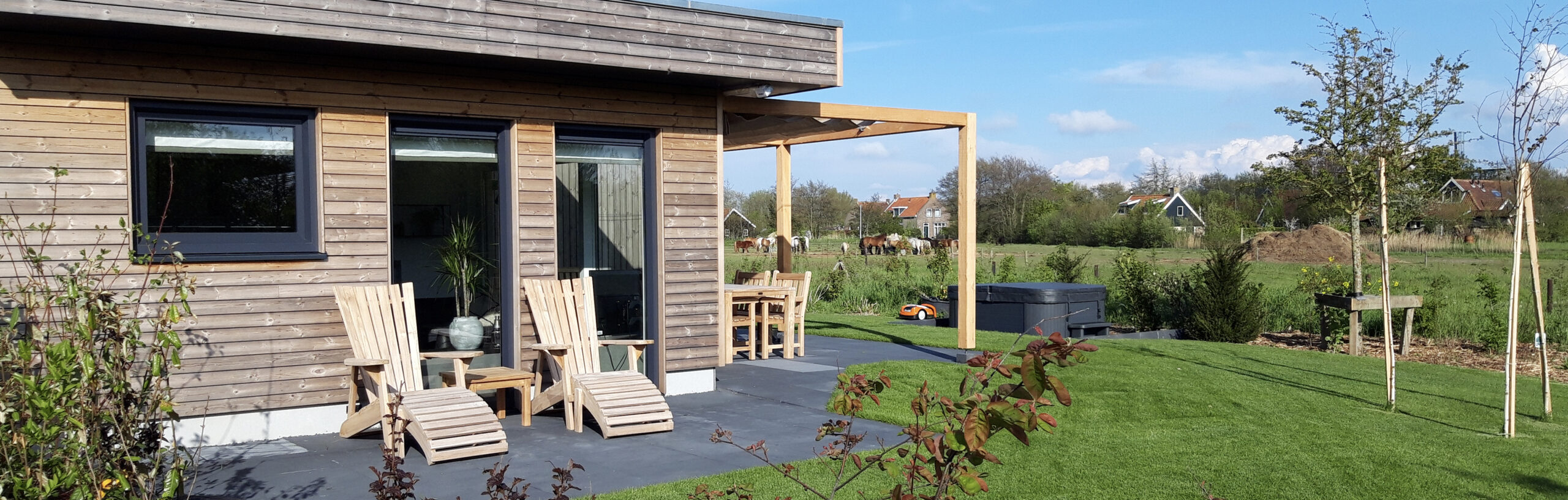De tuin gelegen op het zuiden – waardoor u de gehele dag zon heeft met heerlijke terrasstoelen – biedt u een prachtig vergezicht op o.a. de molen van Formerum en het achter gelegen polderlandschap.